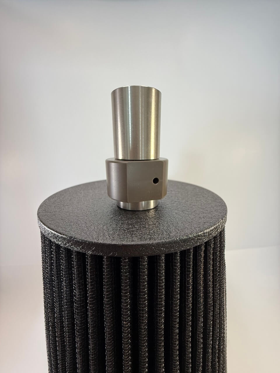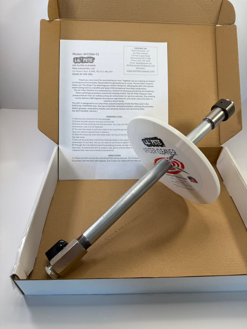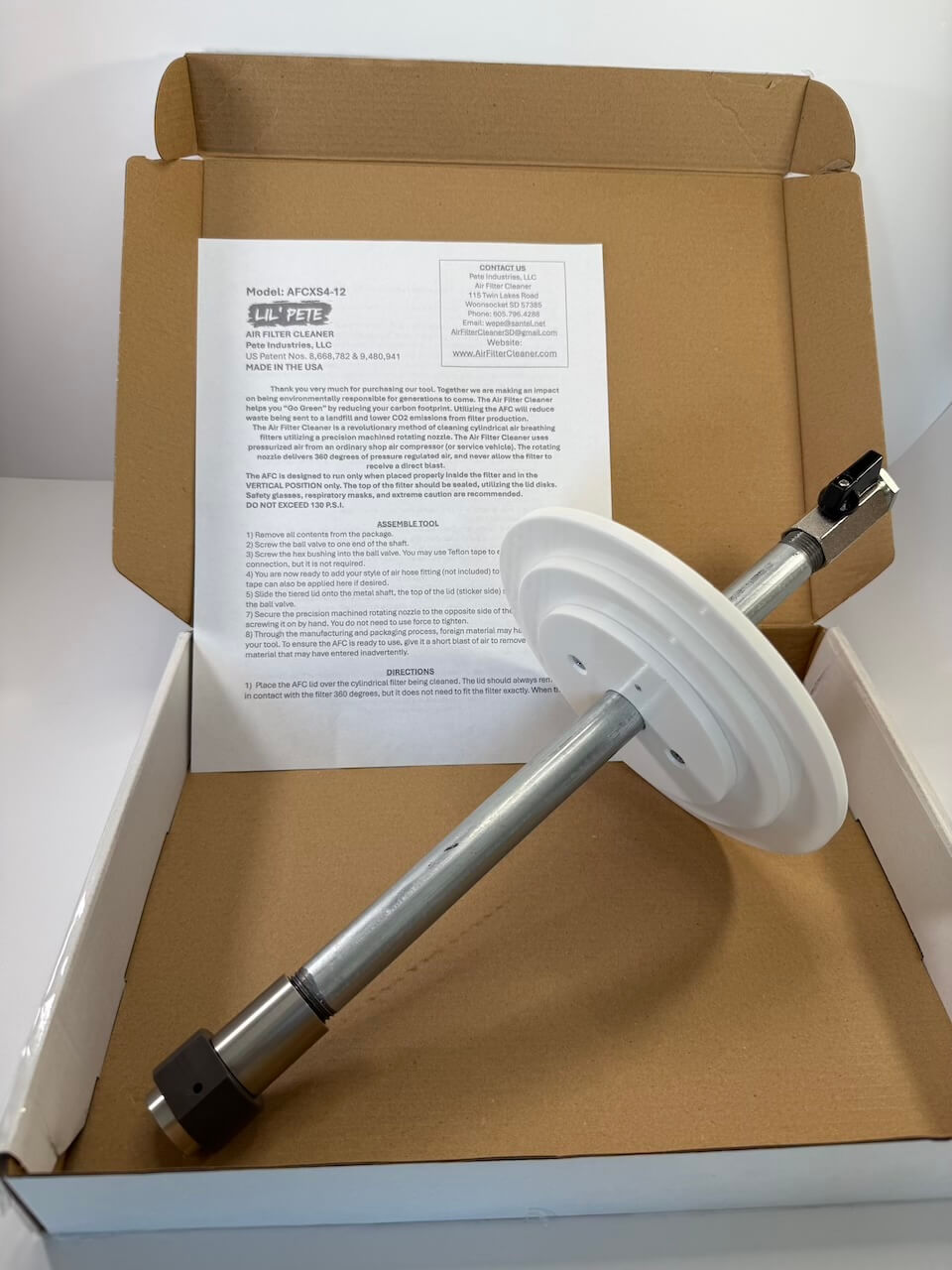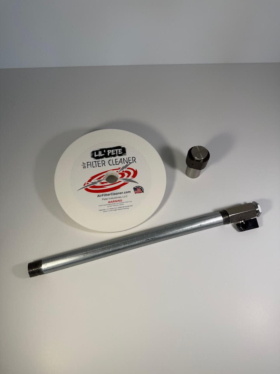 Pete Industries newest and smallest tool yet, the Lil Pete Air Filter Cleaner! Designed to clean 1.5″ to 4″ ID cylindrical air filters with power, precision, and ease. The Lil Pete features a ~12" galvanized steel shaft, a 7" HDPE lid, and our precision-machined two-orifice rotating nozzle.